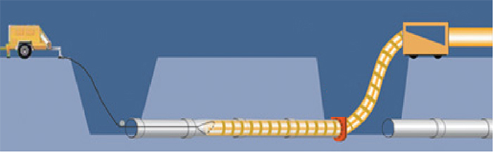 利用外径比旧管道内径略小或相等的复合管,通过变形设备将柔性复合管轧成“U”型并暂时捆绑使其直径减小,通过牵引机(卷扬机)将柔性复合管穿入旧管道,然后用水或压缩空气将其涨开恢复到原来的直径,使内衬管贴到旧管道的内壁上,形成合二为一的“管中管”复合结构。